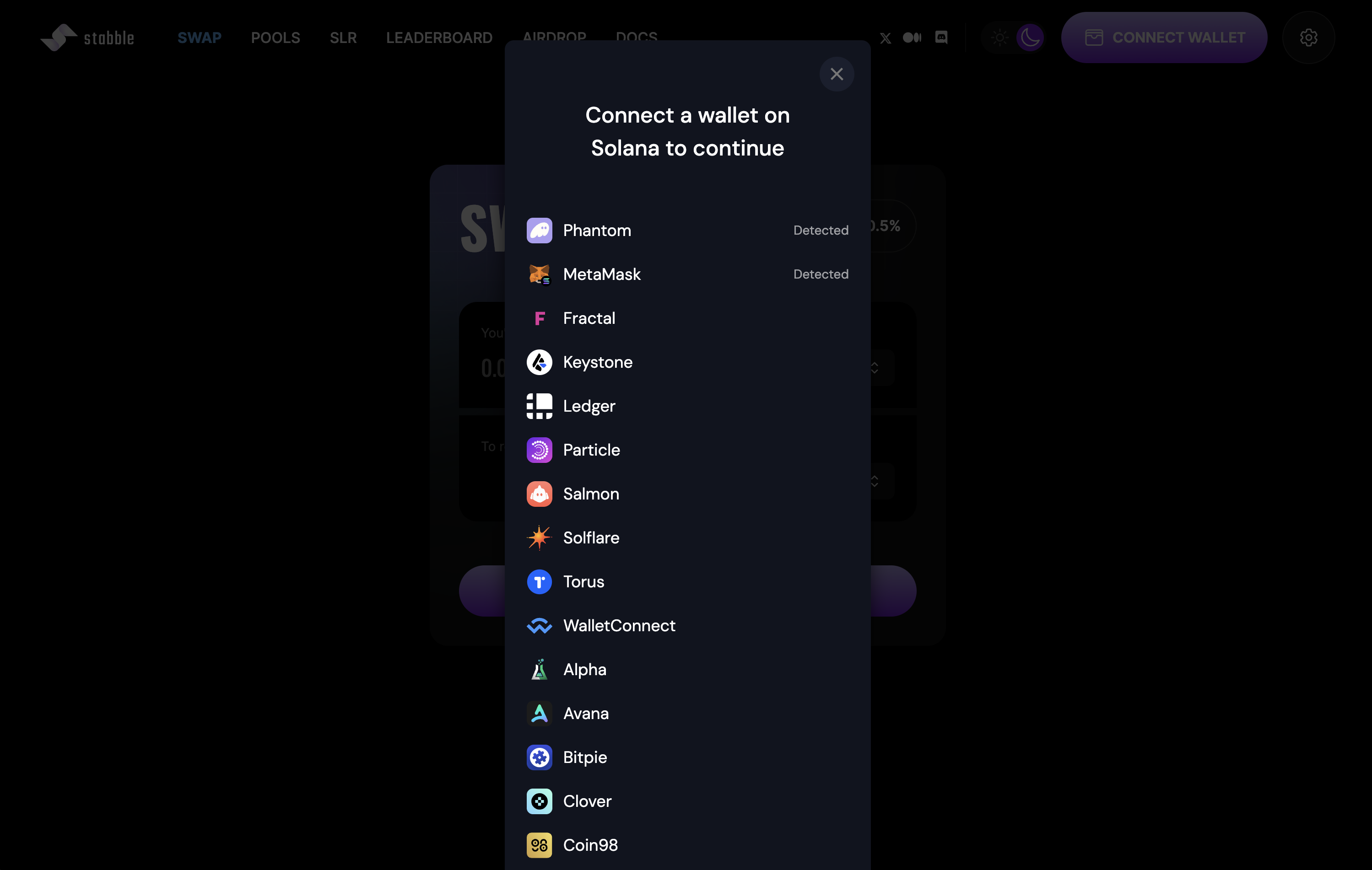 Phantom, MetaMask, Fractal, Keystone, Ledger, Particle, Salmon, Solflare, Torus, Wallet Connect, Alpha, Avana, Bitpie, Clover, Coin98, Coinbase Wallet, Coin98, Coinhub, HuobiWallet, HyperPay, MathWallet, Neko, Nightly, NuFi, ONTO, SafePal, Saifu, SKY Wallet, Solong, Spot, Tokenary, TokenPocket, Trust